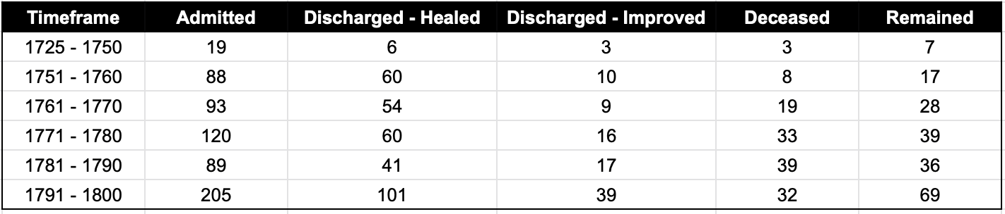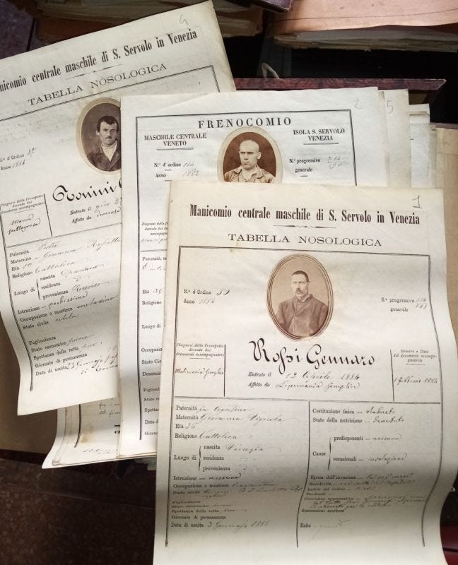 Regarding how many were “isolated” on the island of San Servolo over the centuries, estimates have proven hard to come by, but one English-language travel site puts the number at over 200,000. An Italian book on the history of poor and unwell citizens of Venice puts the number - at least during a 70-year period following the opening of the asylum - at around 600, as can be seen in the translated table below.